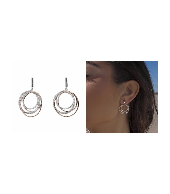 Pendientes bicolor diseño círculos entrelazados y circonitas. El diseño ideal para complementar tus estilismos más elegantes. Pendientes de plata formados por cuatro piezas diseño circular entrelazados entre ellos con detalles de circonita blanca y de bañ