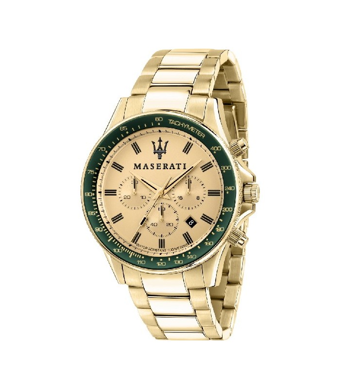 Información general EAN 8033288894780 Marca Maserati Subcategoría Chrono Nombre Sfida Año 2020 Colección Primavera-Verano Tipo de pantalla Analógico Resistencia al agua 10 Bar (Natación) Color de la esfera Oro Color de la aguja (h,m,s) Oro, oro, oro Información sobre la caja del reloj Codigo caja 8873640005 Diámetro de la Caja 44 mm Grosor de la caja 11 mm Material de la caja Inox oro Forma del reloj Redondo Color de la caja Oro Material de la caja (posterior) Inox Tapa trasera Tapa trasera a rosca Cristal Mineral Corona Corona Atornillada Información sobre el movimiento Parte de Movimiento Num. JS25 Fabricante del movimiento Miyota Descargar manual Tipo de pantalla Analógico Mecanismo Cuarzo Batería R364 Duración de la batería 24 Meses Pirateable Sí Información sobre la correa Strap type info Brazalete de acero inoxidable Materia de la correa Metal Adecuado para el tamaño de muñeca 160 - 210 mm Tipo de cierre Cierre desplegable con botones pulsadores Ancho de correa 22.0 mm Ancho de asa 22.0 mm Ancho de la correa a la altura de la hebilla 18 mm Color de la correa Oro Correa con montaje recto Sí Correa original Correa Maserati U8870188145 Sfida