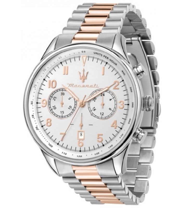 Para Hombre Movimiento Cuarzo Analógico o digital Analógico Tipo de correa Acero Tipo de cristal Mineral Diámetro de la caja 45 mm Resistencia al agua (metros) 100 Color del dial Plateado Color de la correa Oro Rosa, Plateado Color caja Plateado Características extra Calendario, Cronógrafo