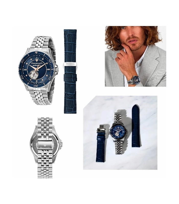 Reloj Maserati Hombre Sfida Automático Esfera azul R8823140013: Reloj Maserati para hombre automático en acero inoxidable y esfera en color azul. Dispone de tres agujas en dorado y marcadores con brillantes y el logotipo de la marca en la posición del 12. La esfera contiene una parte transparente que permite ver el mecanismo del reloj. Incluye una correa de piel azul. Es un diseño elegante, perfecto para el día a día.Este reloj viene con garantía oficial y estuche original de la marca MaseratiArtículoRelojMaterial brazaleteAceroMaterial de la cajaAceroDiámetro de la caja44 mmResistencia al agua10 ATMTipo de relojAnalógicoMovimientoAutomáticoCierreDesplegable con pulsadorGarantíaGarantía de 3 añosMarcaMaseratiGéneroHombreColor esferaAzulColor BrazaleteAcero