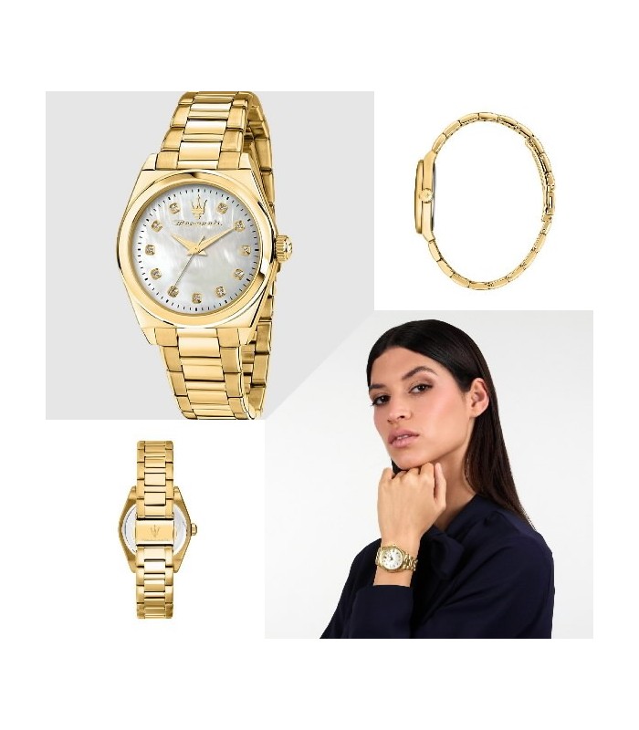 CaracterísticasReloj de mujer Maseratti R8853152502 de acero y correa dorada. Reloj para mujer, ref. R8853152502, colección VELOCITÀ, en acero, con movimiento de cuarzo y función solo tiempo. El reloj cuenta con una correa de acero con cierre oculto. La caja mide 35 mm de diámetro y rodea una esfera blanca protegida por un cristal mineral resistente. Resistente al agua hasta 50 m (5 ATM). El reloj se presenta en su embalaje original y viene con un certificado de garantía de 2 años.Forma cajaRedondaMaterial cajaOroDimensiones caja35 mmGrosor caja9 mmColor esferaBlancoColor correaOroMaterial correaAceroTipo de cierreDoble pulsadorMaterial cristalMineralResistente al aguaSíResistencia agua hasta50 mTipo de movimientoCuarzo analógico
